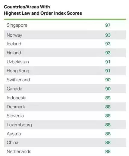 2018年美國民意調(diào)查公司蓋洛普公布了最新的《全球法律與秩序報告》(2018 Global Law and Order report)。該報告根據(jù)全球142個國家和地區(qū)的居民反饋,基于居民自身的安全感,對全球各地的地點進行了排名,得分越高,說明安全系數(shù)越高。新加坡以97分排名第 一,然后是挪威、冰島、 芬蘭以93分并列第二至四位。這一點可以說是全球許多移民人士選擇移居新加坡的一個主要原因。