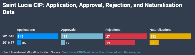 圣盧西亞2018財年的年度報告中顯示,該計劃在其第二個全年運營中籌集了約2800萬美元。在此財政年期間,投資公民單位(CIU)共收到345份申請,其中188份已經批準,該計劃在上一個財政年度僅收到36份申請,其中僅17份獲批。