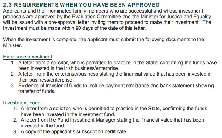 除了再次重申不得融資以外,此次法案更新還首次提到了“預(yù)批復(fù)”環(huán)節(jié),即投資人的投資申請(qǐng)由評(píng)估委員會(huì)(Evaluation Committee)和愛(ài)爾蘭司法和平等部長(zhǎng)( The Minister for Justice and Equality)批準(zhǔn)后將獲得“預(yù)批函”(Pre-approval letter)。