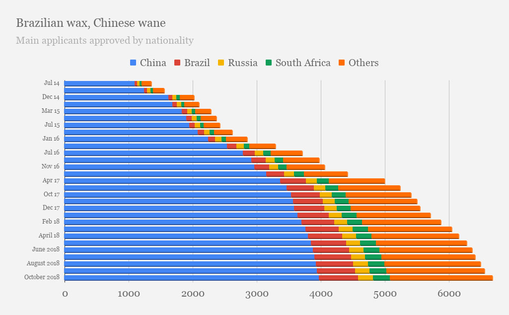 眾所周知,作為歐洲熱門的移民國家,葡萄牙近年來備受全球投資者的喜愛。根據(jù)葡萄牙移民局(SEF)最新發(fā)布葡萄牙黃金簽證大數(shù)據(jù)顯示,截止2018年10月,葡萄牙黃金居留簽證申請人獲批總數(shù)達(dá)6562位,副申請人獲批總數(shù)11125個。中國投資者獲批繼續(xù)維持第一,為3952個,占比60%,通過房地產(chǎn)投資獲批的主申請人總數(shù)6202人。