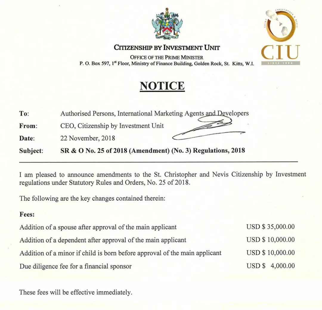 11月22日,圣基茨·尼維斯投資移民局局長Les Khan發(fā)布一則公告并對將要發(fā)布的新政等問題召開了發(fā)布會。公告中降低了投資移民項(xiàng)目對主申請人獲到圣基茨·尼維斯身份之后,增加受養(yǎng)人的收費(fèi):新增配偶費(fèi)用降為3.5萬美元,新增子女(在獲批前出生及18歲以下)和父母費(fèi)用降為1萬美元每位。