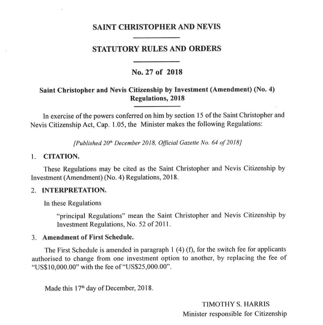 圣基茨·尼維斯總理哈里斯此前曾宣布,該國(guó)的投資移民計(jì)劃需要修改一些費(fèi)用細(xì)則。近日,圣基茨·尼維斯正式發(fā)布通告,房地產(chǎn)投資與捐款投資之間的轉(zhuǎn)換費(fèi)用將由以前的10000美元上漲為25000美元。