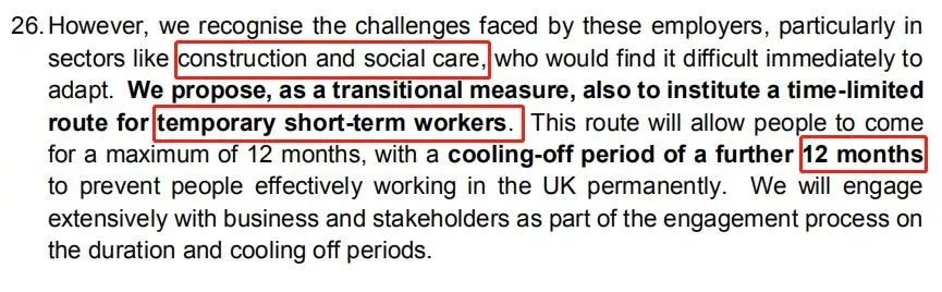 英國(guó)《移民白皮書(shū)》明確指出,作為一項(xiàng)過(guò)渡性政策措施,內(nèi)政部將針對(duì)建筑工人、餐廳服務(wù)員、酒店服務(wù)生等低技術(shù)含量的工作新增一類短期臨時(shí)工簽,該簽證將允許申請(qǐng)人來(lái)英國(guó)工作12個(gè)月。