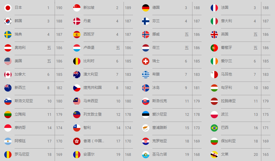 今年異軍突起的亞洲國(guó)家不止日本一個(gè),新加坡護(hù)照的免簽落地簽國(guó)家數(shù)量也從173個(gè)增長(zhǎng)到了189個(gè),位居第二名。原本風(fēng)光的德國(guó),今年和老鄰居法國(guó)、韓國(guó)一起并列第三。