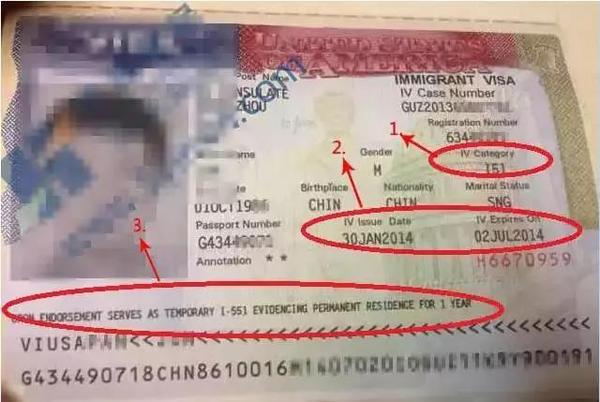 3、標(biāo)識(shí)3處英文的意思是“一旦憑此移民簽證入境美國(guó)后,那么此簽證有效期自動(dòng)延長(zhǎng)至一年”,就是說(shuō)即使您還沒(méi)有及時(shí)拿到綠卡,在一年中您也可憑此移民簽證出入美國(guó),無(wú)需辦理其他簽證。